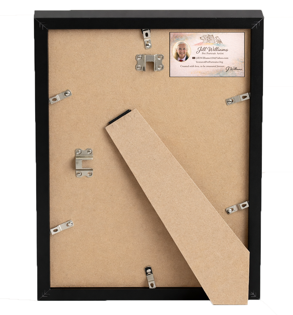 For an extra $75, your portrait can be delivered in a clean, classic black frame. Ready to display the moment it arrives. Each frame includes built-in easel for tabletop or desk—easily removable if you prefer to hang your portrait on the wall.